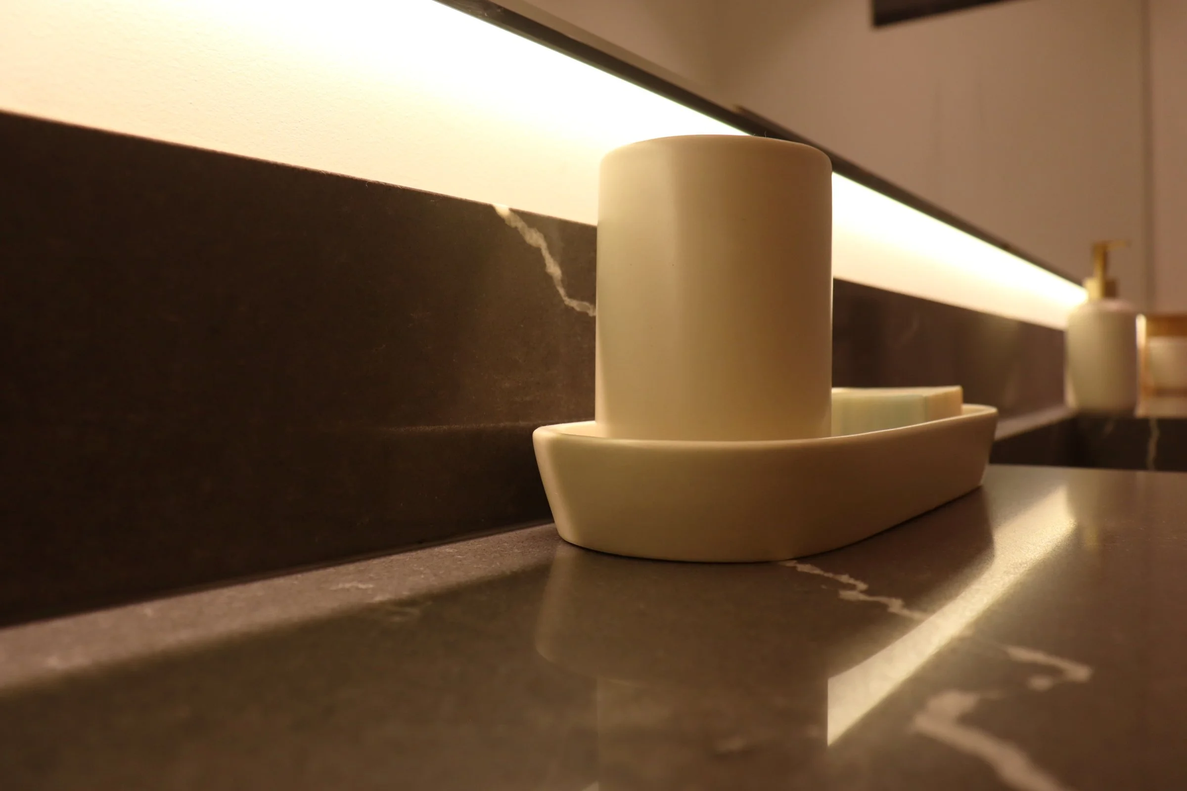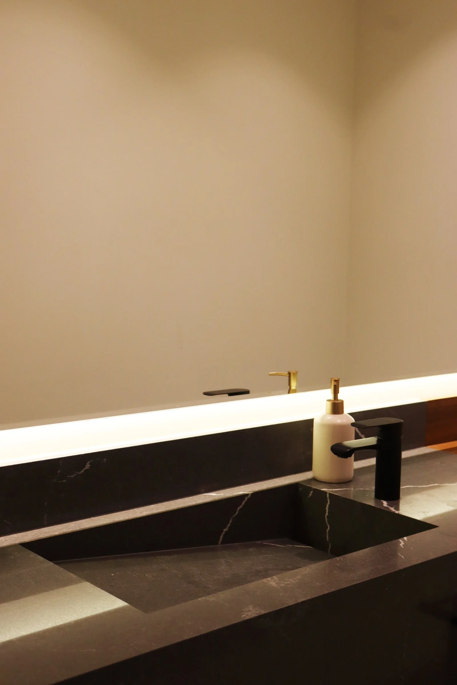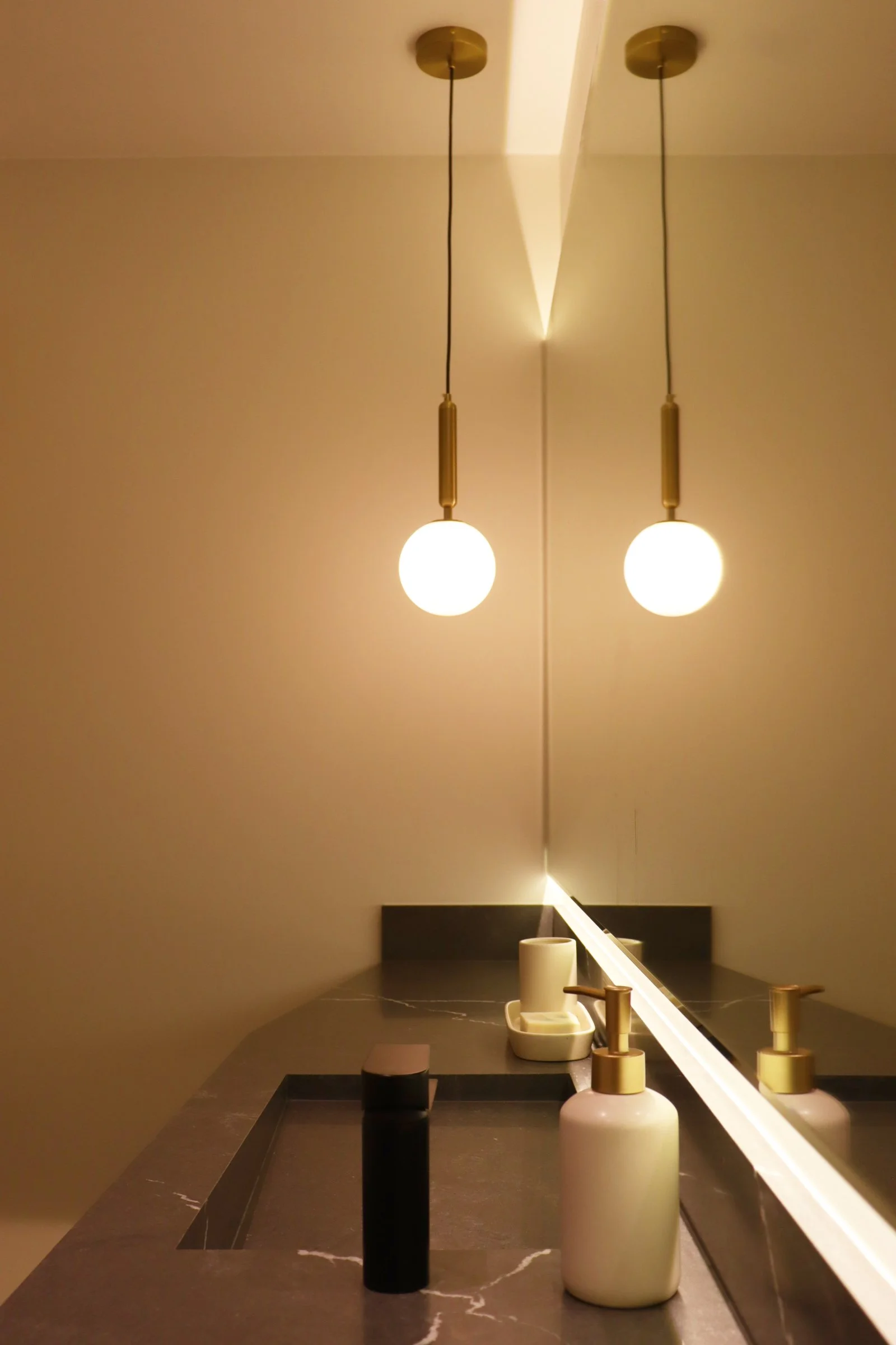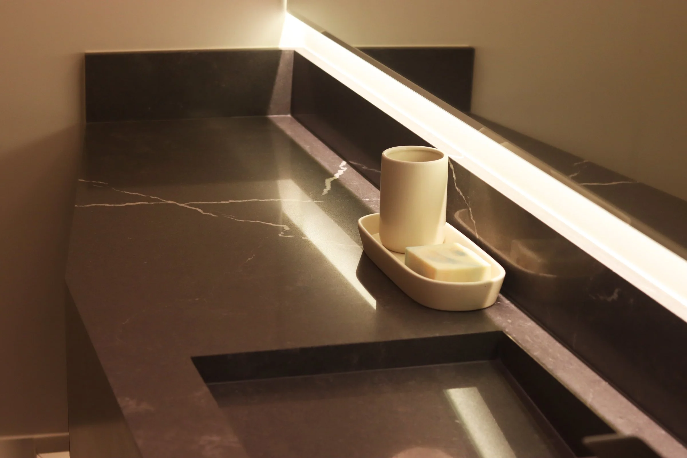 Nuestra propuesta se basó en colocar un particular mueble longitudinal hecho en cuarzo en su totalidad a lo largo del espacio para aprovechar así el gran largo del ambiente y un espacioso espejo retroiluminado para acompañar dicha amplitud. Adicional a esto, añadimos detalles como una luminaria colgante para acompañar con calidez y luminosidad este espacio e incluimos un mueble bajo enchapado en madera para el almacenaje de accesorios🧴🧻.