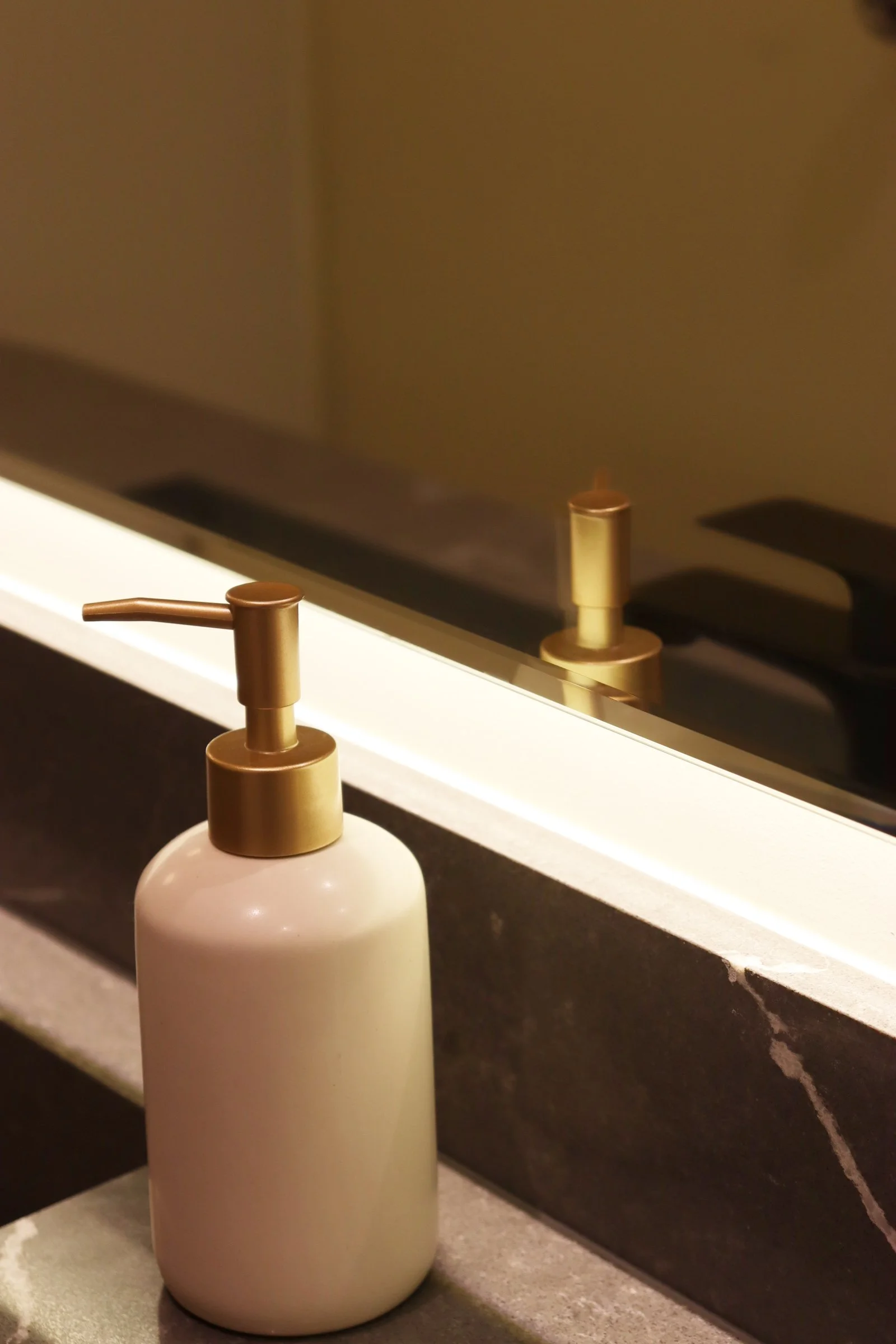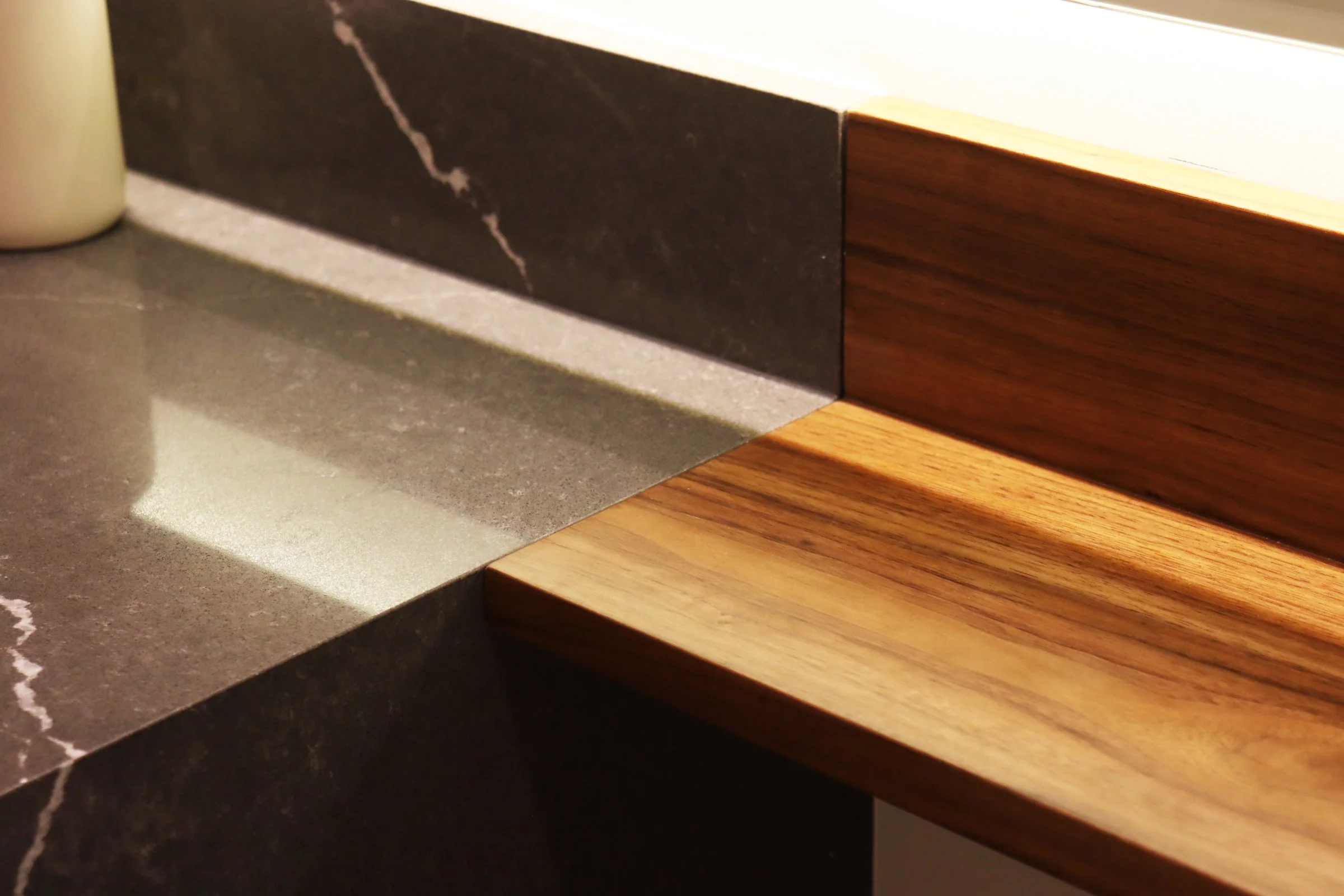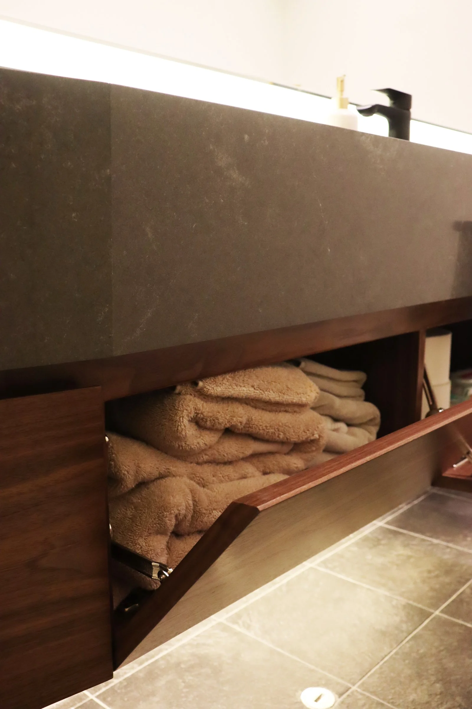 Nuestra propuesta se basó en colocar un particular mueble longitudinal hecho en cuarzo en su totalidad a lo largo del espacio para aprovechar así el gran largo del ambiente y un espacioso espejo retroiluminado para acompañar dicha amplitud. Adicional a esto, añadimos detalles como una luminaria colgante para acompañar con calidez y luminosidad este espacio e incluimos un mueble bajo enchapado en madera para el almacenaje de accesorios🧴🧻.