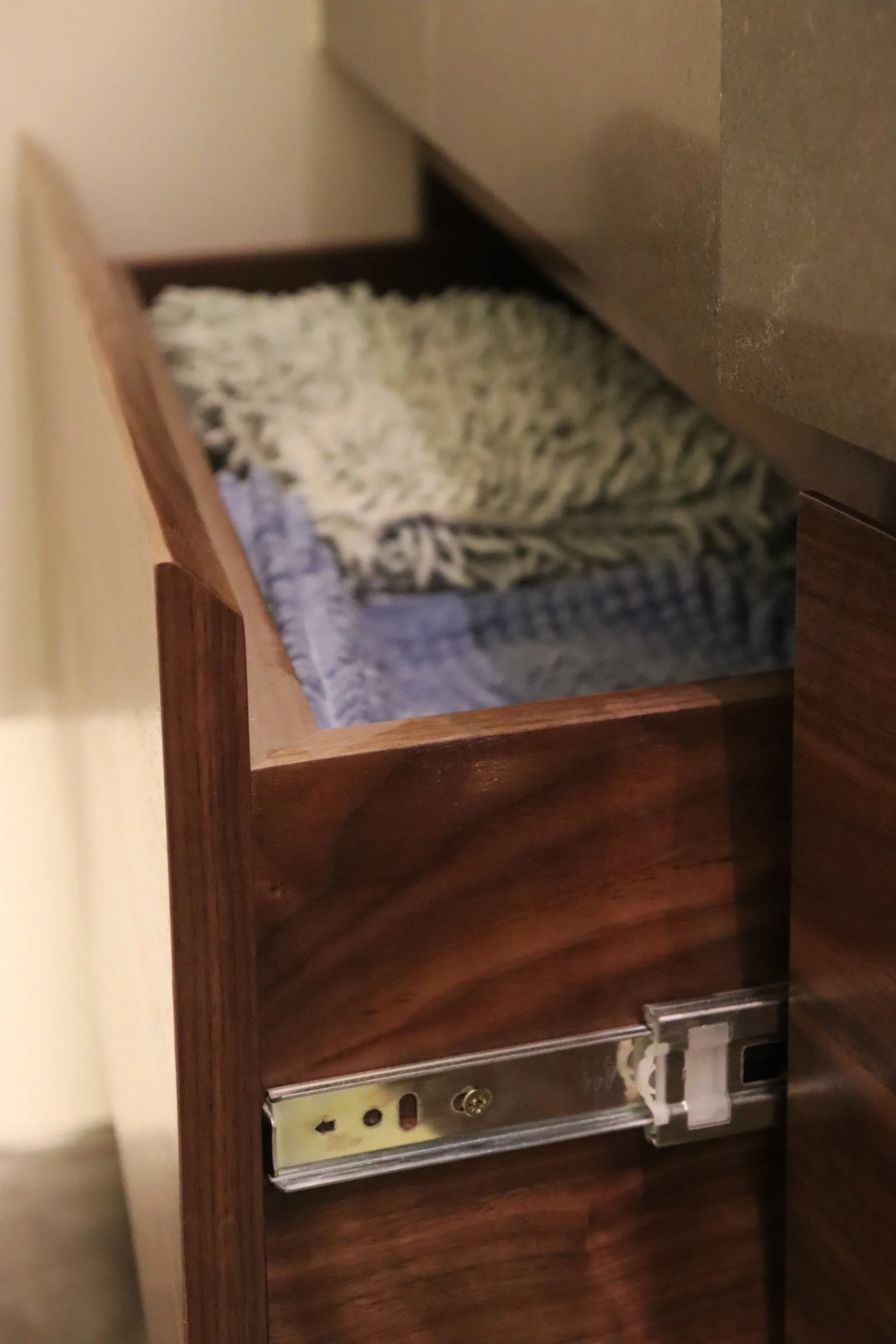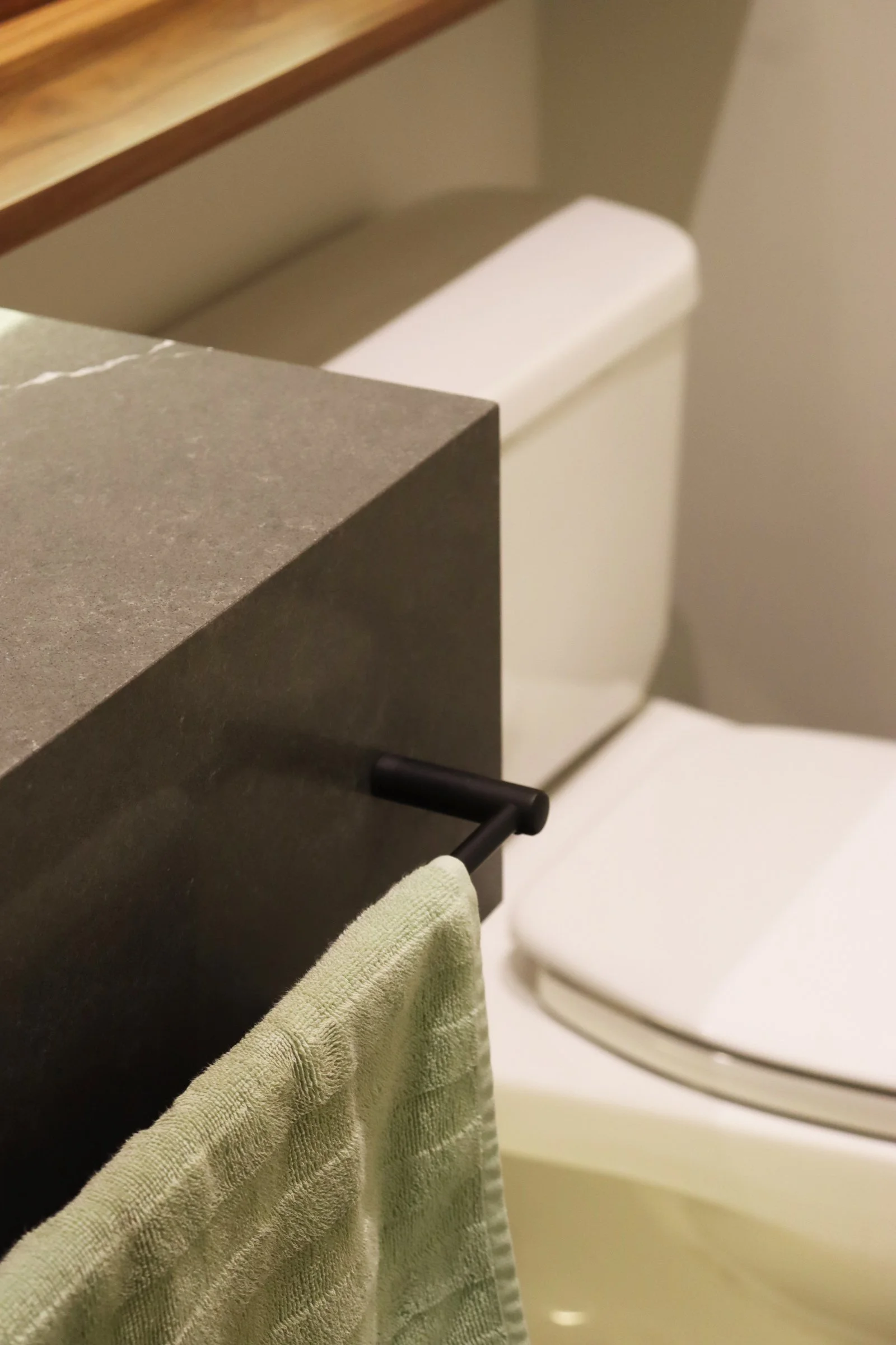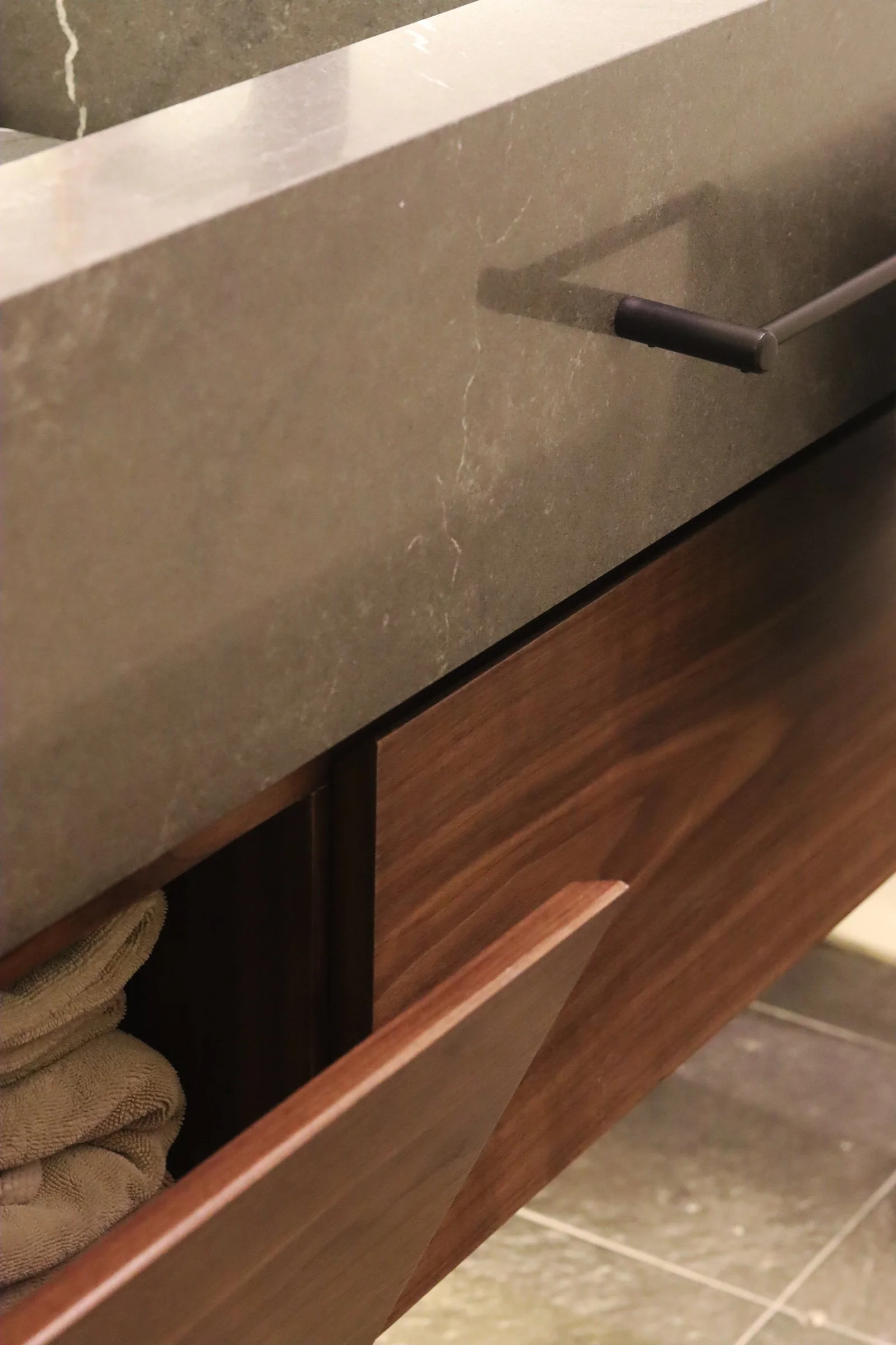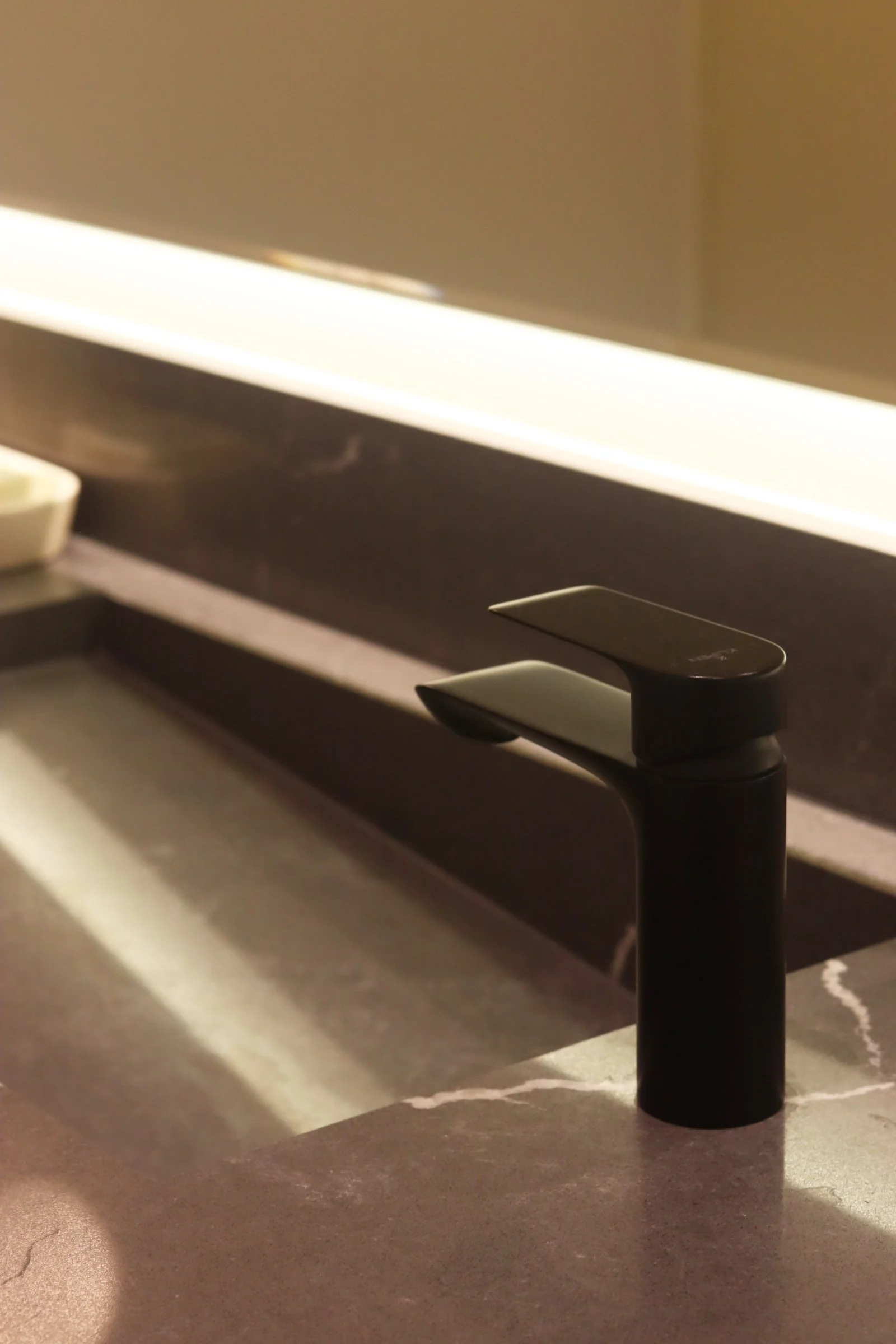 Nuestra propuesta se basó en colocar un particular mueble longitudinal hecho en cuarzo en su totalidad a lo largo del espacio para aprovechar así el gran largo del ambiente y un espacioso espejo retroiluminado para acompañar dicha amplitud. Adicional a esto, añadimos detalles como una luminaria colgante para acompañar con calidez y luminosidad este espacio e incluimos un mueble bajo enchapado en madera para el almacenaje de accesorios🧴🧻.