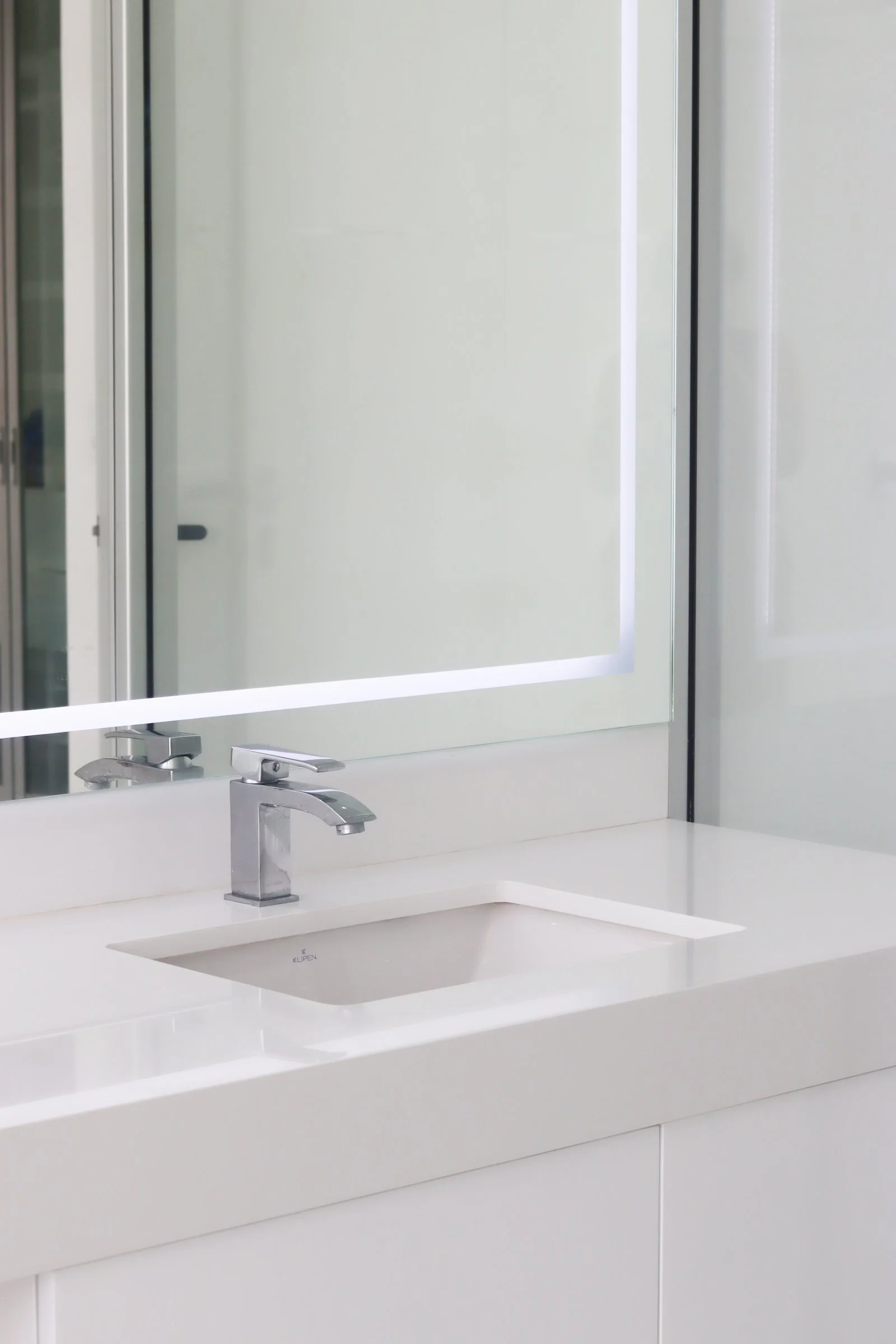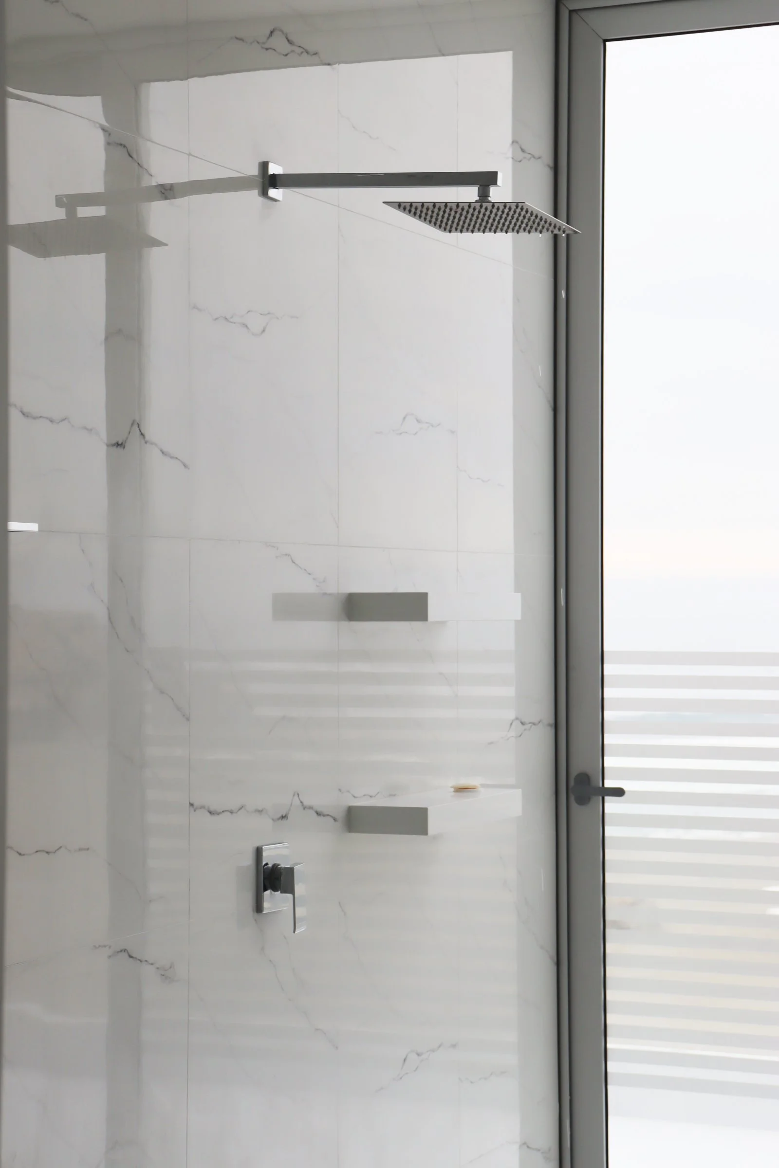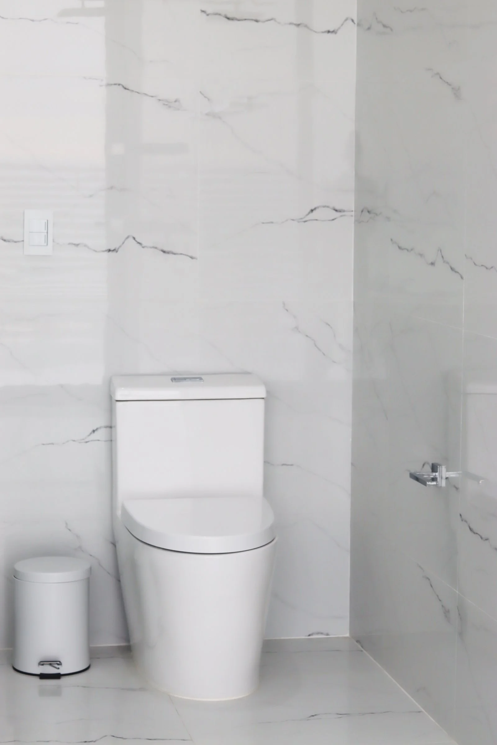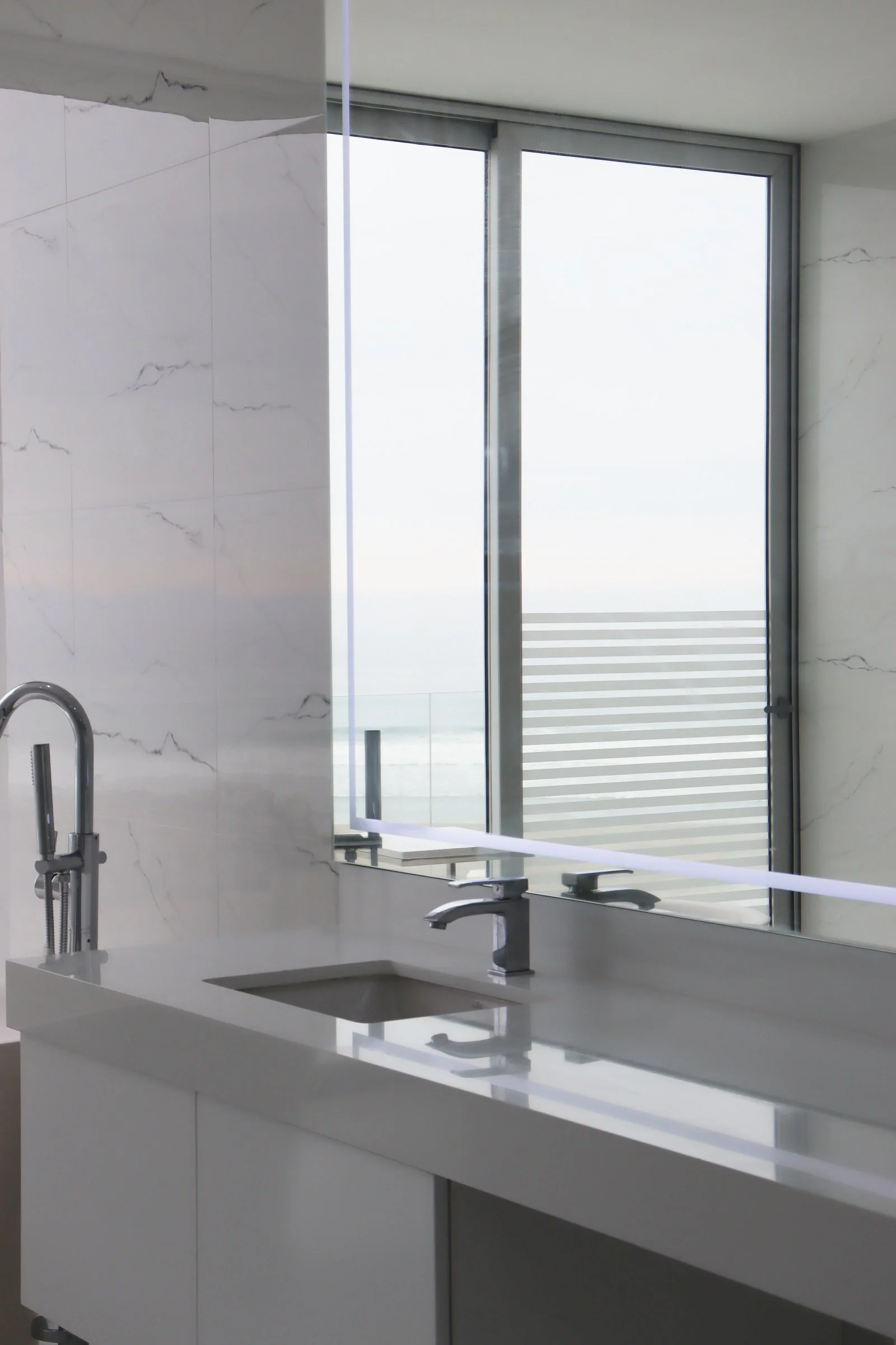 Los materiales y acabados que se utilizaron fuerzo tableros de cuarzo, pisos y paredes en porcelanato tipo mármol , carpintería de aluminio natural con mamparas herméticas, espejo retroiluminado con detalle de luz LED. 🧴🫧🚽